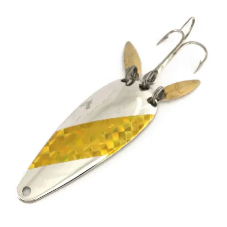 Caratterizzato da una distintiva striscia diagonale olografica dorata sul corpo in nichel lucidato, questo ondulante vintage mette in risalto il design creativo della Marathon Bait Company. Con sede nel Wisconsin dal 1929 al 1979, il produttore ha dotato questo modello 7546 di una configurazione unica a doppia paletta posteriore. Due piccole palette a foglia di salice color oro sono fissate all'anellino spaccato insieme all'amo triplo, aggiungendo ulteriori punti di riflesso luminoso nella sezione caudale. Con un peso di 12 g (2/5 oz) e una lunghezza di 6 cm (2 1/4"), l'esca è in eccellenti condizioni (5/5), con il nastro riflettente e la finitura metallica estremamente ben conservati. Il retro del metallo stampato mostra una superficie argentata pulita e liscia, tipica dell'attrezzatura prodotta negli USA in quell'epoca.