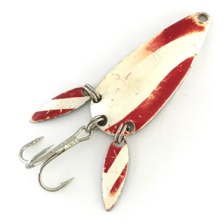 Strisce diagonali rosse e bianche creano un motivo ad alta visibilità sulla faccia di questo ondulante da 4,5 cm (1 3/4"). Sulla parte inferiore nichelata è impresso il marchio Marathon, segno distintivo dell'azienda del Wisconsin attiva dal 1929 al 1979. Questo esemplare è identificato dal codice 8200, caratterizzato dall'inclusione di due lamelle soniche in coda. Queste due piccole lamelle metalliche allungate sfarfallano vicino all'ancoretta, fornendo riflessi extra e mascherando il profilo dell'amo. Con un peso di 8g (1/4oz), l'esca è bilanciata per versatili applicazioni di lancio. La condizione è valutata 4/5, con la vernice che mostra lievi segni del tempo mentre la finitura in nichel sottostante rimane brillante. La minuteria fissata saldamente trattiene le lamelle e l'ancoretta, preservando la configurazione originale di questa attrezzatura americana.