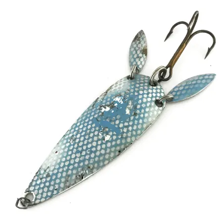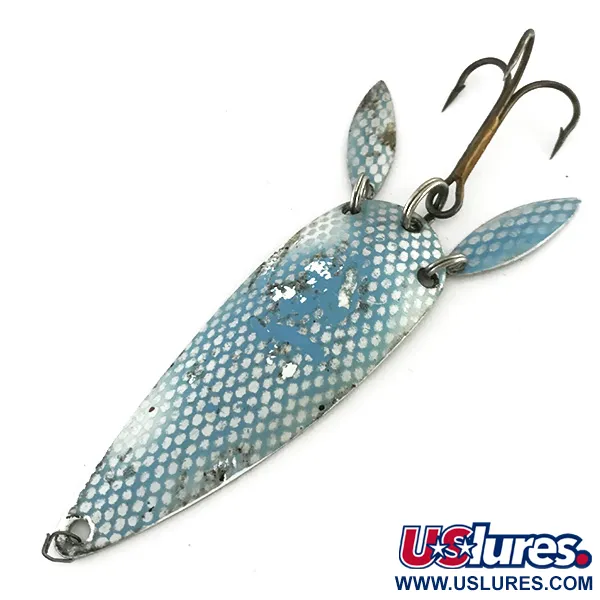 Un vivace motivo a nido d'ape blu e bianco decora la parte anteriore di questo ondulante da 7,5 cm (3"). Identificato dal codice prodotto 8429, la costruzione presenta due piccole palas vibranti a forma di foglia di salice fissate tramite anellini spaccati vicino alla coda. Queste palette riflettenti offrono flash visivi aggiuntivi e servono a mascherare l'amo triplo con finitura bronzata. Con un peso di 17 g (3/5 oz), l'esca è un design classico della Marathon Bait Company, attiva nel Wisconsin dal 1929 al 1979. Il retro rivela una finitura in nichel lucidato dove sono leggermente visibili sul metallo le scritte "M-1" e "NAVY". Valutata attualmente con un punteggio di 4/5, la verniciatura mostra lievi segni di usura ma mantiene la sua distintiva texture superficiale.