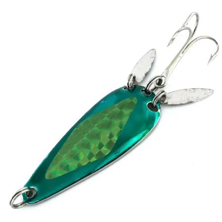 Due "sonic blades" argentate a foglia di salice sono montate sul retro di questo ondulante da 6 cm (2 1/4"), un elemento di design distintivo della Marathon Bait Company. Identificato dal codice prodotto 9023, questo artificiale da 12 g (2/5 oz) presenta un lato anteriore verde acqua con una striscia olografica a rombi incorporata. Questo esemplare specifico riflette l'eredità manifatturiera dell'azienda con sede nel Wisconsin che ha prodotto attrezzatura da pesca dal 1929 al 1979. Il lato posteriore è rifinito con una nichelatura lucida e lo stato generale è valutato 5/5. Queste palette extra forniscono un bagliore tremolante destinato a simulare il movimento della coda di un pesce foraggio, nascondendo allo stesso tempo l'ancoretta. La componentistica rimane salda, con gli anellini spaccati originali che fissano le palette e l'amo al corpo a forma di goccia.