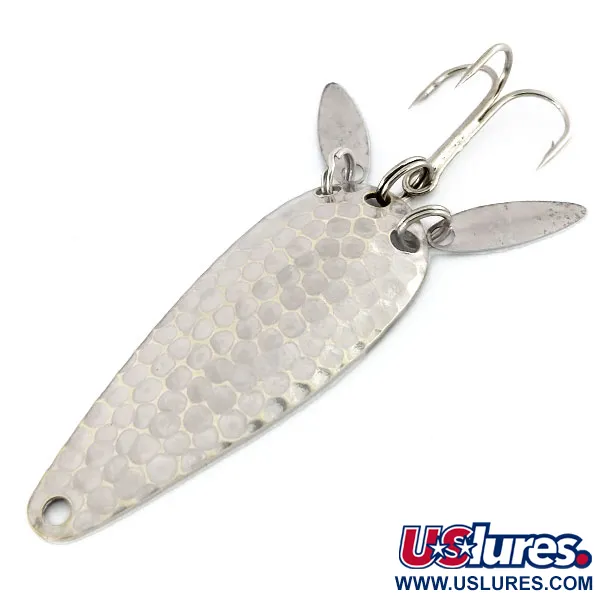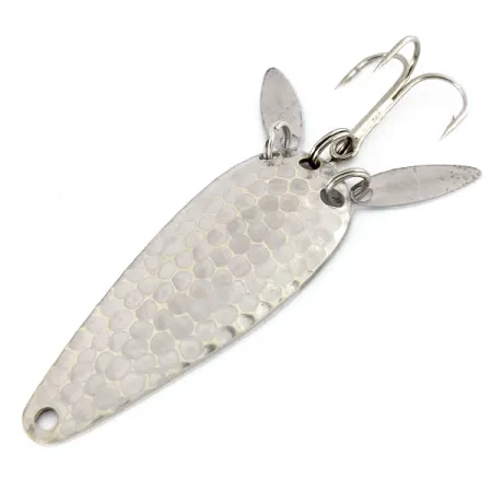Il nichel martellato fornisce una superficie alveolata a questo ondulante da 12g (2/5oz), progettato per catturare e diffondere la luce in un modo che le superfici metalliche lisce non possono fare. Prodotto dalla Marathon Bait Company, che ha operato nel Wisconsin dal 1929 al 1979, questo specifico modello 9910 misura 6 cm (2 1/4"). Una caratteristica tecnica distintiva è la coppia di piccole palette sonore allungate fissate agli anelli spaccati vicino alla coda. Queste palette servono a un duplice scopo: mascherano parzialmente l'ancoretta affilata e creano lampi visivi secondari destinati a imitare il movimento della coda di un pesce esca. Il lato concavo presenta uno stampo "MARATHON" chiaro, che identifica la sua origine da uno dei produttori di attrezzatura da pesca più prolifici del Midwest della metà del secolo. Questo esemplare è in condizioni 5/5, mantenendo una finitura lucida e pulita su tutto il corpo principale e sulla minuteria. Il profilo a goccia e la distribuzione del peso sono adatti per tecniche di lancio o traina che richiedono una silhouette metallica.
