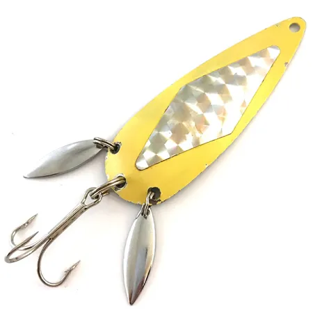 Lungo 7,5 cm, questo cucchiaino ondulante si distingue per la faccia gialla brillante impreziosita da un motivo centrale olografico a diamante. Due palette sonore lucidate sono montate accanto all'ancoretta, creando una superficie visiva aggiuntiva che nasconde abilmente le parti metalliche. Questo artificiale da 16 g (3/5 oz), catalogato con il codice prodotto 5411, presenta un retro in nichel lucido chiaramente stampato con il marchio Marathon. Proveniente dalla Marathon Bait Company del Wisconsin, attiva dal 1929 al 1979, il metallo mostra una finitura molto pulita con una valutazione delle condizioni di 5/5. La vernice originale rimane vibrante, contrastando efficacemente con le proprietà riflettenti delle mini-palette argentate e la luce prismatica dell'inserto UV testurizzato.
