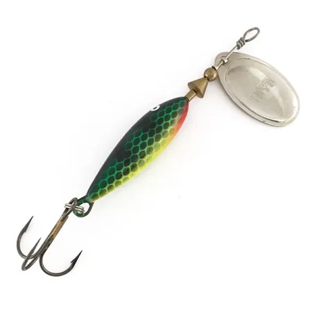 Una vivace fantasia a squame a nido d'ape verde che sfuma in riflessi gialli e neri caratterizza il corpo zavorrato di questo Matzuo FinSpin, identificato dal codice prodotto 7894. Con una lunghezza di 8,25 cm (3 1/4"), il design presenta una pala in tonalità argento lucido a forma di foglia di salice, stampata con il nome del modello e montata su una staffa per la rotazione. Con un peso di 7g (1/4oz), l'esca è costruita su un robusto asse in metallo con distanziatori color ottone e un occhiello di attacco superiore. La finitura verniciata rimane nitida con una definizione chiara dei dettagli degli occhi, ottenendo una valutazione di 5/5. L'attenzione di Matzuo per le texture realistiche è evidente nella profondità della griglia di squame, che completa i componenti metallici riflettenti e l'ancoretta affilata fissata tramite un anellino spaccato.