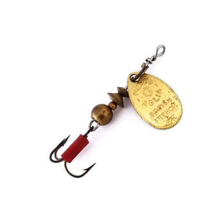 Con un peso di 2,5 g (3/32 oz), la paletta in ottone di questo cucchiaino rotante presenta uno stampaggio netto che ne identifica le origini francesi. Il Mepps Aglia 0 è un design leggendario e questa unità, catalogata con il codice prodotto 10558, misura 4,5 cm (1 3/4") di lunghezza totale. Sul metallo dorato sono impresse le scritte "MEPPS AGLIA" e "BRITISH FRENCH PAT.", con "MADE IN FRANCE" chiaramente visibile sul retro. Il corpo è costruito con una sfera in ottone pieno e due distanziali conici in ottone disposti su un asse in acciaio inossidabile. Una distintiva guaina rossa è montata sul gambo dell'ancoretta, un classico stimolo visivo utilizzato da Mepps da decenni. Originariamente inventate in Francia da Andre Meulnart nel 1938, queste esche venivano assemblate negli USA utilizzando componenti francesi importati. Questo esemplare è in condizioni 5/5, presentandosi straordinariamente pulito con la sua lucentezza metallica originale intatta. Il sistema di rotazione a cavalierino e cono è progettato per agevolare la rotazione della paletta durante un recupero costante.