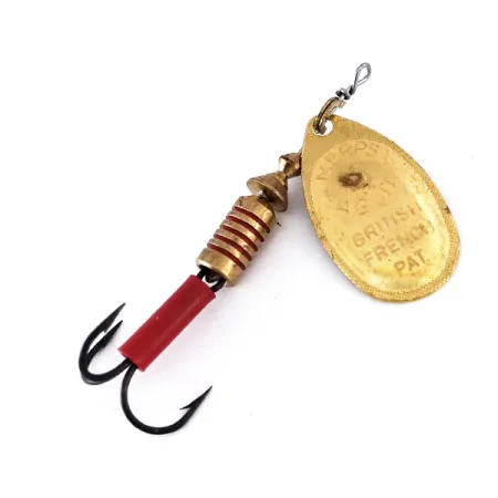 Sulla paletta con finitura dorata è impresso il marchio 'British French Pat.', un richiamo alla lunga tradizione internazionale di questo Mepps Aglia 3. Con un peso di 7g (1/4oz) e una lunghezza di 7cm (2 3/4"), questo specifico esemplare presenta una guaina in plastica rosso vibrante sul gambo dell'ancoretta, fornendo un chiaro contrasto visivo con la struttura metallica. Il retro della paletta reca i marchi 'For Breck's Canada' e 'Made in France', identificando la sua distribuzione tramite l'importatore canadese che ha contribuito a diffondere il design del 1938 di Andre Meulnart. Il corpo in ottone pieno è rifinito con una profonda zigrinatura orizzontale, che fornisce il peso necessario per il lancio e funge da ancoraggio per la cavalletta conica. Ogni componente di questo rotante in condizioni 5/5, dalle armature in filo di ottone alla placcatura in oro lucido, riflette la costruzione durevole che ha reso questi cucchiaini degli standard mondiali. Questo codice prodotto 10079 rappresenta il design Aglia di medie dimensioni, frequentemente utilizzato per insidiare grosse trote, black bass o lucci.