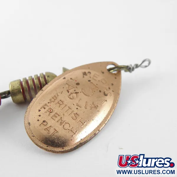 Sul metallo della paletta a goccia sono impressi i marchi "MEPPS AGLIA 3 BRITISH FRENCH PAT.", un legame diretto con le origini francesi del 1938 del leggendario design di Andre Meulnart. Questo esemplare, identificato dal codice prodotto 1131, pesa 1/4oz (7g) e mantiene un aspetto molto pulito coerente con una valutazione di 4/5. Il retro della paletta è chiaramente marcato "MADE IN FRANCE", a indicare l'epoca in cui questi specifici componenti venivano prodotti all'estero prima dell'assemblaggio negli USA. Lungo 2 1/4" (6 cm), l'esca presenta un corpo in ottone zavorrato con profonde scanalature riempite di pigmento rosso. L'ancoretta è dotata di un caratteristico tubicino in plastica rossa, che funge da punto di attacco ad alta visibilità per i pesci che inseguono. Costruita con un cavalierino specializzato, la paletta tonalità bronzo è progettata per iniziare a ruotare nell'istante in cui entra in acqua, generando le specifiche vibrazioni meccaniche che hanno reso questo modello un classico per i pescatori di trote e black bass da decenni.