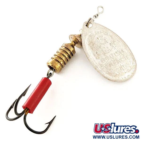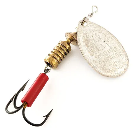 Una guaina rosso vivace copre il gambo dell'ancoretta, offrendo un punto di mira ad alta visibilità per i pesci predatori. Con un peso di 7g e una lunghezza di 7cm, questo Mepps Aglia 3 è un classico esempio di design di cucchiaino rotante prodotto per l'azienda canadese Breck's negli anni '70. La paletta con finitura argento presenta stampigliature nitide che includono il nome del produttore e i riferimenti ai brevetti francesi, con solo lievissimi segni di movimentazione coerenti con una valutazione di condizione 5/5. Un corpo pesante in ottone zigrinato fornisce il peso necessario per il lancio, posizionato dietro un cavalierino che permette alla paletta di ruotare sull'asse d'acciaio. Questo assemblaggio meccanico riflette il design originale del 1938 di Andre Meulnart, focalizzato sulla rotazione immediata al momento del recupero. L'esca è rifinita con un'ancoretta in metallo scuro e un tradizionale occhiello avvolto in testa per un fissaggio sicuro della lenza.