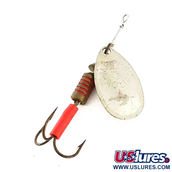 Una classica paletta argentata con la stampigliatura "MEPPS AGLIA" e la misura "3" definisce questo particolare esemplare. Con un peso di 7 g (1/4 oz) e una lunghezza di 7 cm (2 3/4"), l'esca presenta l'iconico corpo in ottone segmentato da distinte scanalature verniciate in rosso. Questo modello, codice prodotto 9628, include un tubicino di plastica rossa posizionato sul gambo dell'ancoretta, una scelta di design spesso utilizzata per fornire un punto d'attacco per il pesce. L'assemblaggio riflette il periodo di transizione del marchio, utilizzando componenti prodotti in Francia e assemblati negli USA. Questa esca mostra un'eccellente cura, mantenendo una finitura brillante e meritando una valutazione di condizione 5/5. Il sistema di rotazione a cavalletta è chiaramente visibile, progettato per una rotazione fluida della paletta attorno all'asse centrale in acciaio. Un semplice occhiello in filo metallico all'estremità anteriore è pronto per il collegamento a un moschettone o a un finale.