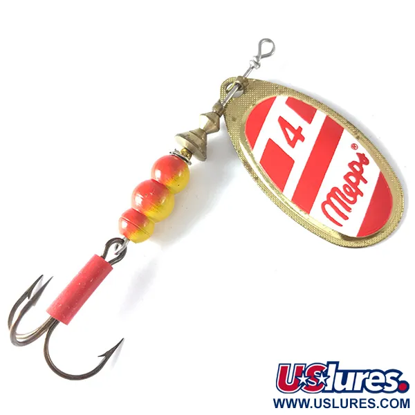 Archivio museo: Mepps Aglia 4 Rotante, Rosso/Bianco/Oro, 9g, Tubetto rosso, #3630