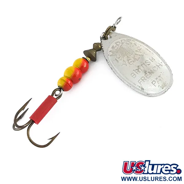 Sulla pala d'argento sono impressi chiaramente i segni della sua storia, che identificano questo specifico esemplare come un modello "British French Pat". Questo Mepps Aglia 4, catalogato con il codice prodotto 8085, misura 7 cm (2 3/4") e pesa 9 g (1/3 oz). La struttura presenta una sequenza di tre perline gialle e rosse situate sopra un'ancoretta protetta da un segmento di tubicino rosso. La componentistica è in condizioni 5/5, mantenendo una finitura brillante sulla pala e punte degli ami affilate. Sul retro della pala, il timbro "Made in France" indica l'origine dei componenti, che sono stati successivamente assemblati per il mercato americano. I distanziali color ottone e il sistema di rotazione a forma di cono sono progettati per facilitare il movimento della pala nel momento in cui entra in acqua. L'asse in metallo è dritto e l'assemblaggio complessivo mostra la cura meticolosa dedicata alla sua produzione.