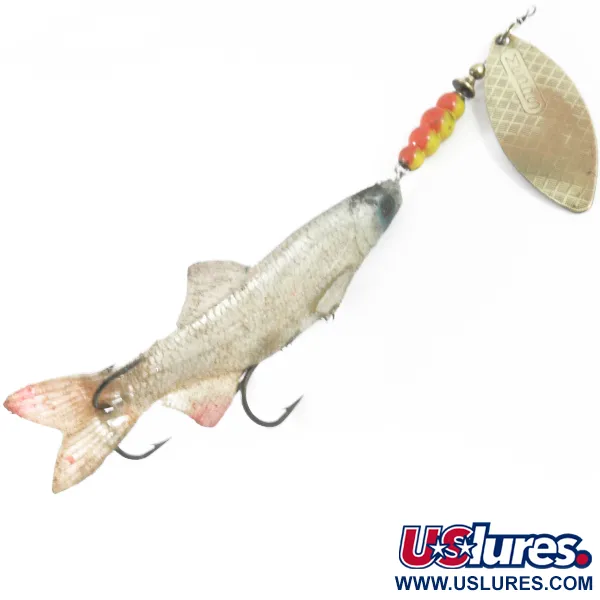 Lungo 13 cm, il profilo realistico da minnow di questo modello abbina un corpo morbido e naturale al classico bagliore di una pala di produzione francese. La pala a foglia di salice in ottone, stampata con l'iconico logo Mepps e testurizzata con un fine motivo a diamante, caratterizza la serie Long progettata per recuperi ad alta resistenza. Assemblato negli USA con componenti prodotti in Francia, questo artificiale ha il codice prodotto 3621 e pesa ben 30 g. Una sequenza di quattro perle graduate rosse e gialle crea un forte contrasto cromatico con i toni naturali argento e marrone del corpo dell'esca. Due ancorette affilate sono integrate nel design, una sulla pancia e una in coda. L'artificiale è in condizioni 4/5, con vernice ben conservata su scaglie e pinne, mantenendo la sua originale consistenza flessibile.