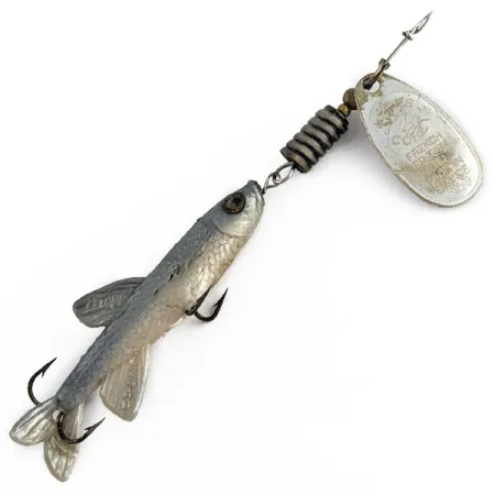 La paletta argentata di questo esemplare riporta l'iconica stampigliatura "French Patent", a testimonianza della sua origine risalente alla metà degli anni '70. Con un peso di 6 g (3/16 oz), questo Mepps Comet 2 Mino, identificato dal codice prodotto 17483, presenta componenti prodotti in Francia e assemblati negli Stati Uniti. Il tema del colore argento è coerente in tutto l'artificiale, dalla paletta in metallo lucido al corpo in gomma morbida con motivo a scaglie. Con una lunghezza di circa 7,6 cm (3 pollici), l'assemblaggio include un peso in ottone zigrinato e un trailer progettato per imitare un piccolo pesce esca. Le condizioni sono un solido 4/5, con lievi segni del tempo pur mantenendo l'integrità della coda flessibile e l'affilatezza delle punte dell'amo. La finitura metallica sulla paletta rimane nitida, consentendo di leggere facilmente i dettagli del marchio sulla superficie riflettente.