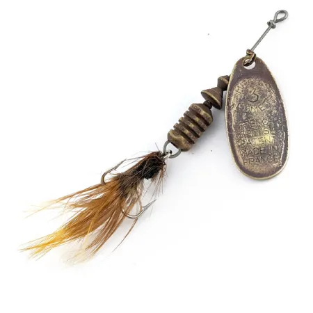 Sulla paletta in ottone sono chiaramente punzonati l'iconico '3 COMET' e i marchi di brevetto franco-britannici; questo rotante di metà secolo riflette la storia transatlantica del marchio Mepps. Con un peso di 6,5 g (1/4 oz), l'esca presenta un design modulare in cui l'armatura in acciaio da 7 cm (2 3/4") consente la sostituzione rapida dell'ancoretta piumata. Questi componenti specifici sono stati prodotti in Francia e successivamente assemblati negli USA, una pratica comune negli anni '60 che ha definito l'epoca del modello 20052. Il corpo in ottone è composto da un barilotto scanalato e da un distanziatore conico, che mostrano segni di usura naturali che gli conferiscono una valutazione delle condizioni di 3/5. L'amo è ancora adornato dal suo dressing originale in piume marroni e color zenzero, che garantisce un profilo naturale. Questo esemplare dimostra la classica geometria della paletta francese, progettata per svariate tecniche di lancio e recupero.