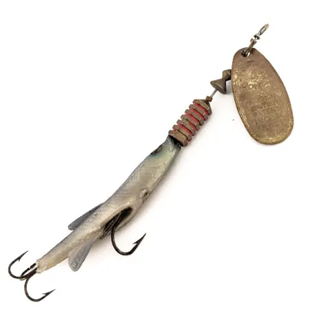Questo esemplare è stato assemblato negli USA negli anni '70 utilizzando componenti di fabbricazione francese. Con un peso di 12g (2/5 oz) e una lunghezza di 12cm (4 3/4"), questo cucchiaino rotante di misura 4 presenta una pala in ottone con il marchio British Patent chiaramente impresso. Il corpo è formato da anelli in ottone verniciati di rosso che sfumano in un pesciolino in gomma dai toni argentati. Identificato dal codice 12642, l'artificiale è in condizioni 4/5, con finiture metalliche pulite e la sezione in plastica morbida ben conservata. Il sistema di ami include un vistoso amo singolo ventrale e un'ancoretta affilata in coda.
