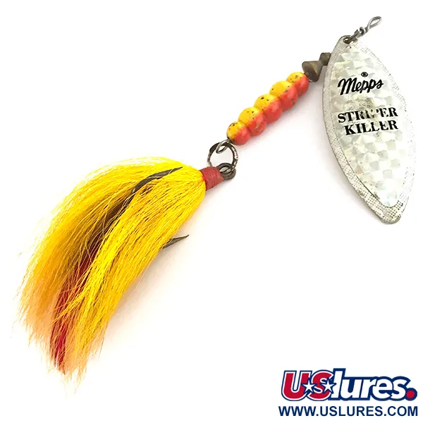 Con un peso considerevole di 30 g (1 oz), questo cucchiaino rotante di produzione francese presenta una grande paletta argentata con i marchi impressi "Mepps Striper Killer" e "Giant Killer". Una serie di perline gialle e rosse vivaci forma il corpo segmentato, che termina con un'ancoretta pesantemente piumata con piume gialle e una punta di rosso alla base. Questo esemplare, identificato dal codice prodotto 7434, misura 12 cm (4 3/4") di lunghezza totale ed è conservato in eccellenti condizioni 5/5. Il lato posteriore della paletta mostra chiaramente il marchio "Made in France" e il branding "Giant Killer", riflettendo l'eredità di uno dei produttori di attrezzatura da pesca più rinomati al mondo. Progettato per insidiare i grandi predatori in acque profonde, la struttura pesante e la coda piumata garantiscono un profilo notevole senza sacrificare la distanza di lancio. L'integrità dell'armatura in metallo e la pulizia della finitura argentata rendono questo pezzo un esempio di alta qualità della produzione vintage Mepps.