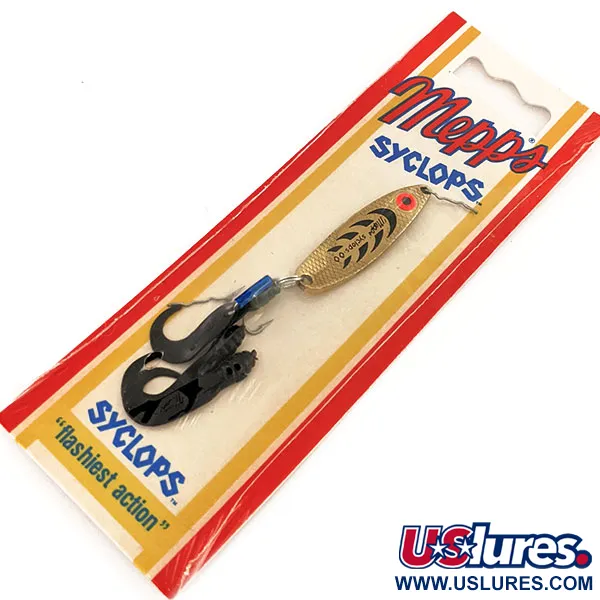 La placcatura in oro cattura la luce sulla distintiva trama martellata a dieci piani di questo ondulante da 4 cm (1 1/2"). Con un peso esatto di 4,5 g (3/16 oz), il Mepps Syclops 00 è progettato per lanci precisi con attrezzature leggere. Questo esemplare, identificato dal codice prodotto 12844, è inutilizzato e conservato nella sua confezione originale in cartoncino rosso e bianco "Syclops". Sul metallo sono impressi i classici identificativi "S" neri e un punto occhio rosso, mentre il retro della confezione descrive le "2 great fishin' ideas" che prevedono il montaggio dell'amo Mister Twister incluso. Il cartoncino riporta l'origine come assemblato negli USA con componenti statunitensi ed esteri, precisamente presso lo stabilimento Sheldon’s Inc. di Antigo, Wisconsin.