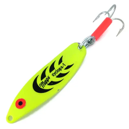 Brillante intensamente sotto la luce UV, la vivace finitura chartreuse di questo Mepps Syclops 1 UV lo rende un'esca ad alta visibilità per acque profonde o giornate uggiose. Prodotto in Francia, questo ondulante misura 6 cm (2 1/4") e pesa 12 g (2/5 oz), con il caratteristico profilo a S che definisce la serie. La superficie è decorata con grafiche nere a mezzaluna e loghi chiari, oltre a un punto d'attacco rosso vicino all'occhiello. Sul retro è montata un'ancoretta affilata protetta da un tubicino di plastica rosso acceso, che completa il corpo fluorescente. Identificata con il codice 11032, l'esca è in condizioni 5/5, mantenendo un aspetto pulito e vibrante su tutta la superficie. Le proprietà UV-reattive consentono all'ondulante di emettere una forte luminescenza verde se esposto alla luce ultravioletta, fornendo un profilo visivo alternativo in ambienti bui.