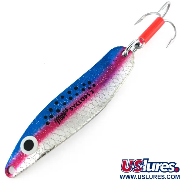 Ornato con una classica livrea Trota, questo ondulante a forma di S presenta una distinta sfumatura dal blu al rosa lungo il bordo superiore. La metà inferiore a scaglie argentee è accentuata da punti neri, che conducono a un occhio bianco e nero prominente vicino all'anello di aggancio. Sul retro, il metallo lucido è chiaramente marchiato con la scritta "MADE IN FRANCE", il brand Mepps Syclops e il peso di 17 g (3/5 oz). Lungo 7,5 cm, questo esemplare riporta il codice 8923 e si presenta in eccellenti condizioni 5/5. La componentistica consiste in un amo triplo affilato dotato di un vivace tubicino attrattore rosso sul gambo. Questo modello taglia 2 riflette la precisione ingegneristica tipica dell'attrezzatura da pesca di produzione francese.