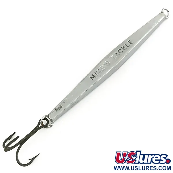 Stampato con "MIKE'S TACKLE" e "SLIM JIM" sui lati piatti opposti, questo jig metallico mette in mostra un classico profilo sottile progettato per la presentazione verticale. Con un peso di 44 g (1 1/2 oz) e una lunghezza di 10 cm (4"), ha una massa sufficiente per raggiungere rapidamente la profondità. La finitura Nickel fornisce una superficie ad alta riflettenza, una scelta tradizionale per imitare il pesce foraggio in varie condizioni di luce. Valutato 4/5, l'esemplare mantiene una brillante qualità riflettente lungo tutto il suo corpo allungato con solo lievi segni del tempo. Presenta un design semplice ma efficace con un'ancoretta robusta collegata tramite un anellino spaccato, abbinata a un occhiello di aggancio solido sulla testa. Questo classico Mike's Tackle, identificato dal codice prodotto 6849, è un esempio per eccellenza della produzione americana di esche metalliche della metà del secolo.