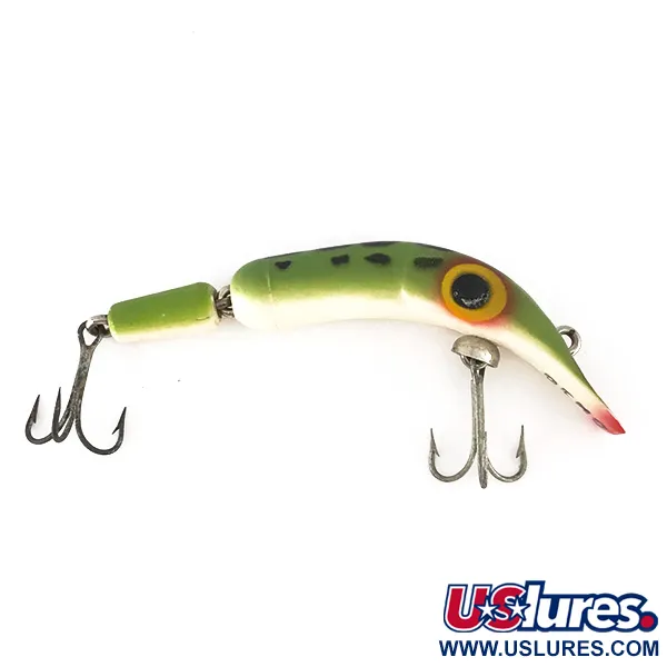 Caratterizzato da una classica finitura Frog con macchie scure su dorso verde, questo Mill Run Beno è un esempio eccellente del design statunitense degli artificiali di metà secolo. Il corpo snodato da 8 cm è composto da due sezioni, che offrono un profilo distintivo per il lancio in acque basse e di media profondità. Il codice prodotto 7846 è associato a questo esemplare, che pesa 7 g. Una paletta anteriore verniciata di rosso crea un forte contrasto visivo con la pancia bianco sporco, mentre i grandi occhi gialli e neri sono posizionati in avanti sulla sezione arcuata della testa. L'hardware è fissato da piastre metalliche e occhielli a vite, che mantengono saldamente in posizione le due ancorette. Questa esca è eccezionalmente ben conservata, meritando una valutazione di 5/5 per la nitidezza della verniciatura e la pulizia delle parti metalliche.