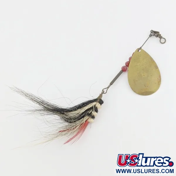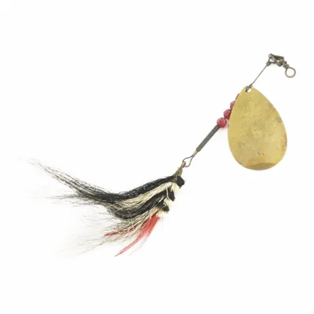 L'ottone lucido conferisce alla paletta a forma di goccia di questo rotante Miller #3 MFG Springwater il suo classico riflesso. Lungo 10 cm (4") e con un peso di 7 g (1/4 oz), l'esca garantisce lanci precisi. Tre perle rosse sfaccettate traslucide creano contrasto sull'asse metallico e sui componenti in ottone. Questo rotante, con codice 24496, testimonia la maestria della Miller Fishing Lure Co. fin dal 1929. L'amo è riccamente guarnito con un mix di peli bianchi e neri e una piuma rosso acceso in coda. Lo stato di conservazione è ottimo (4/5). Un distanziatore in metallo separa le perle dall'occhiello, permettendo alla paletta di ruotare liberamente sull'asse.