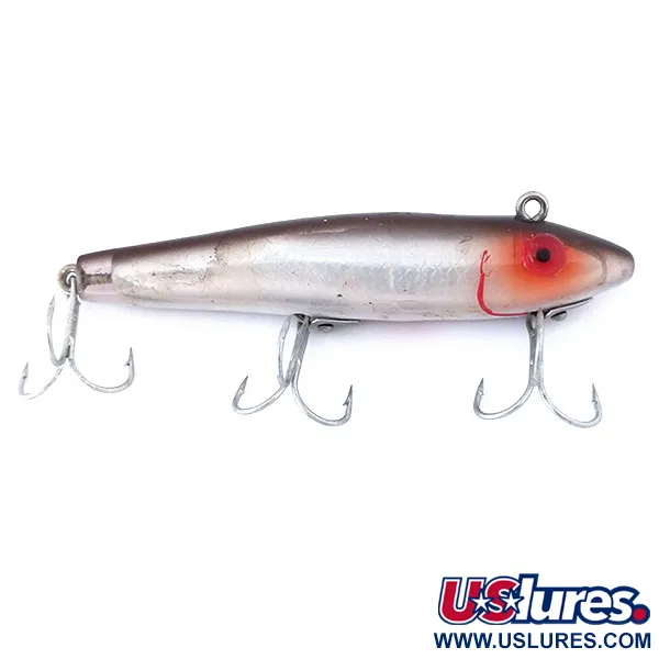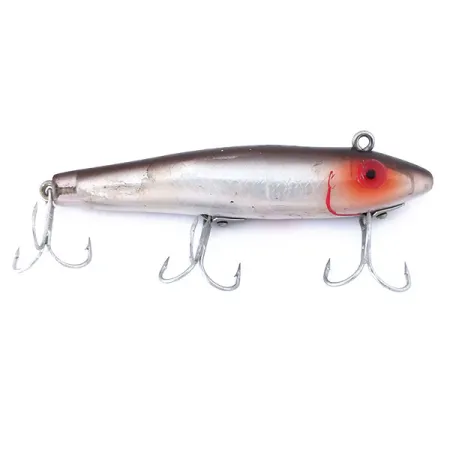 Un peso di 1/2 oz (14 g) conferisce a questo L&S Bait MirrOlure 52M 27 Original la densità necessaria per un twitchbait affondante progettato per raggiungere le colonne d'acqua più profonde. Identificato dal codice prodotto 10997, l'esca presenta il profilo colore M27, composto da un corpo a scaglie argentate, un dorso scuro e una prominente sezione della testa rossa con pupilla scura. Con una lunghezza di 3 3/4 pollici (9,5 cm), la struttura monta tre ancorette argentate fissate con robusti raccordi a vite e piastra tipici della produzione USA di metà secolo. La pancia è contrassegnata da un chiaro stampo rosso '52M27', che rimane nitido contro il sottopancia pallido. Questo esemplare è in condizioni 4/5, mostrando lievissimi segni del tempo pur mantenendo una finitura liscia e pulita sul corpo in plastica. Progettato sia per il lancio che per la traina, è stato originariamente costruito per gestire gli attacchi aggressivi di salmoni, lucci e walleye. L'occhiello di fissaggio è posizionato sulla parte superiore della testa per facilitare l'assetto affondante durante il recupero.