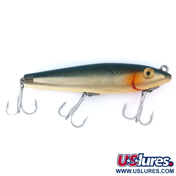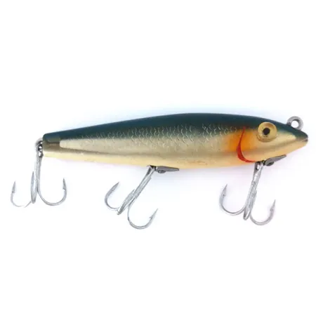 I fianchi con pattern a scaglie in una ricca finitura dorata definiscono l'estetica di questo L&S Bait Mirrolure 7M24, un classico walker di superficie proveniente dagli USA. Con una lunghezza di 11 cm (4 1/4") e un peso di 11 g (2/5 oz), questo modello specifico presenta un dorso blu-verde profondo che sfuma in fianchi metallici testurizzati, accentuati da un vivace segno branchiale rosso vicino alla testa. I grandi e prominenti occhi gialli sono posizionati appena sotto l'occhiello di fissaggio superiore, una caratteristica di design tipica della serie 7M destinata alla presentazione a galla a 0 m. Equipaggiato con tre ami triple affilati, l'hardware rimane lucido e funzionale. Questo esemplare, contrassegnato dal codice prodotto 10990, mostra un eccellente stato di conservazione con una valutazione di 5/5. I collezionisti apprezzeranno il pattern di colore M24, un classico per la pesca a bass, lucci e trote a spinning o traina. Il suo profilo snello a forma di sigaro è progettato per rimanere alto nella colonna d'acqua.