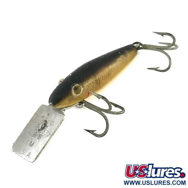 Prodotta negli USA, questa minuscola esca affondante pesa appena 3/32 oz (2,5 g). Questo specifico esemplare MirrOlure, con codice prodotto 8501, misura 1 1/2" (4 cm) e presenta una classica finitura Gold con dorso scuro e sottili accenti rossi vicino alle branchie. L'hardware include due ancorette originali fissate tramite una vite ventrale e un occhiello posteriore. Una caratteristica distintiva di questa costruzione è la paletta di profondità rettangolare in metallo, punzonata con i marchi del produttore. Il corpo mostra i segni del tempo attraverso un leggero opacizzarsi della finitura, meritando una valutazione di conservazione di 5/5. Progettata dalla L&S Bait Company per presentazioni affondanti, i collezionisti cercano spesso queste varianti più piccole destinate a specie come il luccio o il sandre. Gli occhi dipinti rimangono ben definiti rispetto ai fianchi dorati.