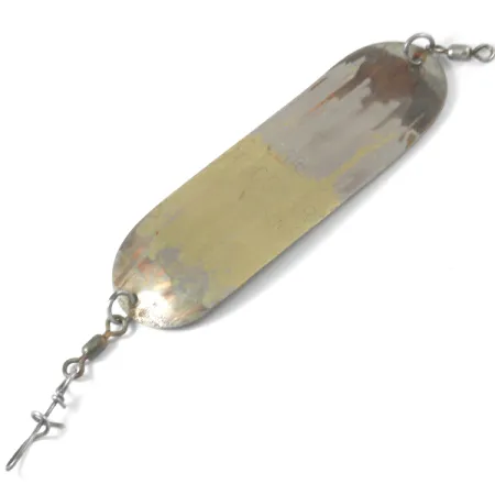 Con una lunghezza di 12 cm (4 3/4"), il corpo metallico di questo flasher presenta il classico contrasto bicolore di una finitura in nichel e ottone. La superficie mostra segni visibili della sua storia in acqua, con usura e ossidazione coerenti con una valutazione dello stato di 3/5. Profondamente stampigliati nella sezione color ottone si trovano i marchi '006 MOOCHER' e 'LUHR JENSEN USA', che identificano questo esemplare con il codice prodotto 3748. Con un peso di 21 g (3/4 oz), l'esca è costruita per la traina e il mooching, dotata di grandi girelle funzionali ad entrambe le estremità per facilitare il montaggio. Il profilo rettangolare arrotondato e la struttura pesante sono stati progettati per durare in acque profonde, sfruttando le diverse proprietà riflettenti delle superfici in nichel e ottone per attirare i pesci in varie condizioni di luce.
