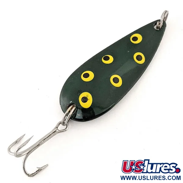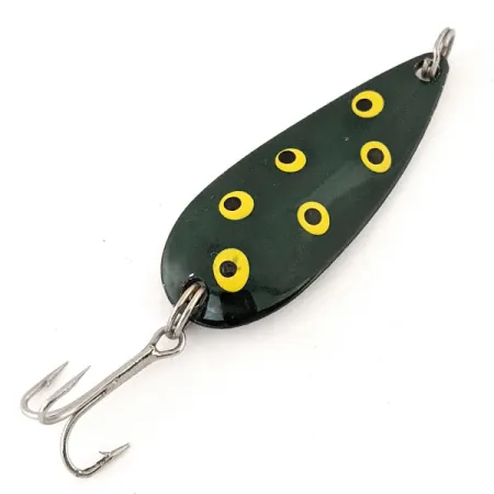 Una vernice verde bosco profondo funge da base per sei occhi gialli e neri dipinti a mano sulla faccia convessa di questo ondulante di produzione giapponese. Con un peso di 11 g (2/5 oz), l'esca è costruita per il lancio in acque aperte o lungo le linee del canneto. Il lato posteriore presenta una finitura in nichel lucidato che riflette la luce, recando il nome "Moriyama" e l'origine "JAPAN" stampati. Con una lunghezza di 5 cm (2"), il profilo a goccia è abbinato a un robusto amo triplo e anellini spaccati originali. Catalogato con il codice prodotto 13117, l'esca non mostra segni significativi di usura e rimane in condizioni eccellenti con un punteggio di 5/5. La tavolozza di colori ad alto contrasto della livrea rana è protetta da un robusto strato di lacca lucida. La scritta "Moriyama" è punzonata con precisione nel metallo sulla curva interna.