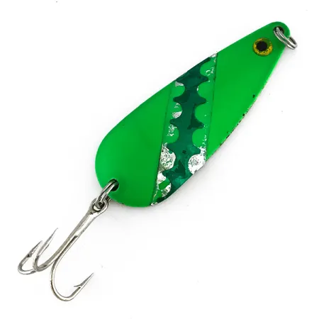 Una robusta costruzione in metallo e una vivace finitura verde definiscono questo ondulante da 25 g (1 oz), progettato per lanci a lunga distanza o per la traina in correnti sostenute. Lungo il corpo di 7 cm (2 3/4"), una striscia diagonale di nichel presenta un caratteristico motivo a dente di sega che crea un netto contrasto con la vernice verde. Un piccolo occhio dipinto di giallo e nero situato vicino alla punta aggiunge un tocco tradizionale alla presentazione complessiva. Stampata in Giappone, l'esca presenta un retro in nichel lucidato che mostra una leggera usura superficiale e una minore ossidazione, coerente con una valutazione dello stato 3/5. La componentistica rimane robusta, con anellini spaccati originali e una solida ancoretta fissata all'estremità più larga. Identificato dal codice prodotto 8263, questo esemplare Moriyama riflette lo stile di produzione utilitaristico tipico delle esportazioni giapponesi della metà del XX secolo. Lo spessore e la distribuzione del peso dell'ondulante permettono di mantenere efficacemente la profondità durante un recupero regolare.