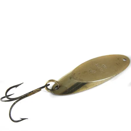 Con un peso considerevole di 35 g (1 1/4 oz), questo ondulante vintage in metallo mette in mostra la struttura in ottone massiccio che ha caratterizzato la prima produzione della Weber negli USA. Con una lunghezza di 6,5 cm (2 1/2"), l'esca presenta un profilo a goccia chiaramente stampato con il nome Mr Champ e il logo distintivo del marchio. Questo specifico esemplare, identificato dal codice prodotto 0648, mantiene una valutazione di conservazione di 3/5, mostrando una superficie brunita che i collezionisti spesso apprezzano come segno di autenticità e del tempo. La componentistica è ancorata da un robusto anello spaccato sul retro, che fissa un grande amo triplo progettato per insidiare pesci predatori di taglia. Weber, un produttore americano con oltre un secolo di storia, ha visto infine questo design di successo passare al catalogo Luhr Jensen. Il metallo di grosso spessore e il semplice foro per la lenza sulla punta affusolata ne sottolineano il design utilitaristico, destinato principalmente al lancio a lunga distanza o alle tecniche di jigging in acque profonde.