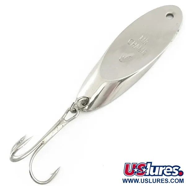 La nichelatura conferisce una finitura classica e riflettente a questa esca metallica da 21g (3/4oz). Prodotto da Weber, produttore americano con un'eredità centenaria nel settore della pesca, il modello Mr Champ è un design successivamente acquisito da Luhr Jensen. Il corpo misura 6cm (2 1/4") e presenta il nome "MR CHAMP" stampato direttamente nel metallo. Questo esemplare, identificato dal codice prodotto 6932, è in condizioni eccellenti con una valutazione di 5/5. Per il montaggio, include un occhiello di testa pulito sulla parte affusolata e un amo tripletta fissato tramite un anello spaccato in coda.