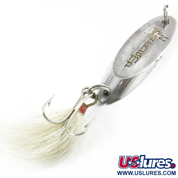 Il marchio Weber MrChamp è chiaramente punzonato sulla superficie nichelata, identificando questo ondulante da 4 cm (1 1/2") come un classico dell'attrezzatura di metà secolo. Prodotto negli USA con il codice 3430, questa esca presenta una finitura in nichel lucidato che cattura la luce lungo il suo corpo a forma di goccia. La sezione caudale è dotata di un'ancoretta piumata, legata con maestria con bucktail bianco e fissata da un caratteristico avvolgimento di filo rosso sul gambo. Con un peso di 8g (1/4oz), l'esca riflette gli elevati standard produttivi mantenuti da Weber prima che il marchio passasse a Luhr Jensen. Questo esemplare è in condizioni 4/5, con una superficie ben conservata e componenti integri che mantengono la brillantezza originale. L'anellino spaccato in testa e il collegamento all'amo sono entrambi robusti, evidenziando il design semplice ma efficace della linea MrChamp.
