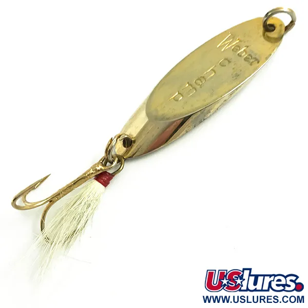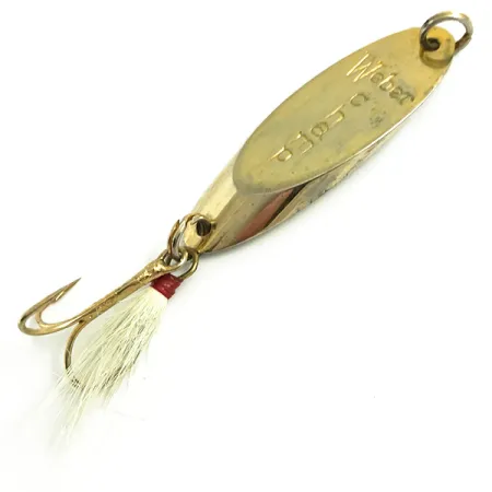 Stampato chiaramente sul corpo in metallo lucido da 14g (1/2oz), il nome Weber identifica questo MrChamp come parte del patrimonio del fishing tackle americano di un'azienda con un secolo di storia tra USA e Canada. Questo esemplare dorato da 5cm (2"), identificato dal codice prodotto 6068, rappresenta il design precedente all'integrazione del marchio nella linea Luhr Jensen. Le condizioni sono eccezionalmente pulite, con un punteggio di 5/5 per la lucentezza preservata della finitura. La coda è dotata di un'ancoretta piumata, con peli bianchi fissati da una tradizionale legatura in filo rosso. Un robusto anello spaccato in punta garantisce un punto di connessione solido per il casting o il jigging.