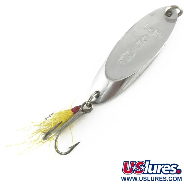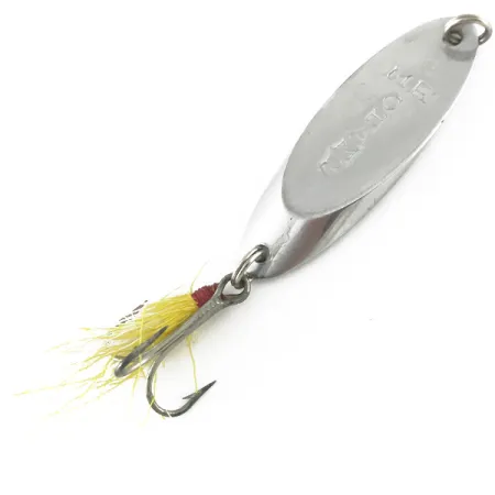 Stampato profondamente nel corpo in argento lucidato, il nome MrChamp identifica un classico della storia dell'attrezzatura americana prodotto da Weber (codice prodotto 6695). Con un peso di 1/2 oz (14 g), questo ondulante presenta un'ancoretta piumata con fibre giallo vibrante e un colletto in filo rosso. Con una lunghezza di 2" (5 cm), la superficie riflettente dell'esca è in condizioni 5/5, apparendo completamente inutilizzata con la sua finitura a specchio originale. Prima che il marchio MrChamp venisse acquisito da Luhr Jensen, Weber ha operato per oltre un secolo come produttore di rilievo negli Stati Uniti e in Canada. Il design compatto e pesante è studiato per la distanza di lancio e per raggiungere profondità dove il suo lampo argenteo rimane visibile. Robusti anelli spaccati collegano le componenti ad entrambe le estremità, riflettendo la qualità costruttiva durevole tipica di questo esemplare di produzione americana.