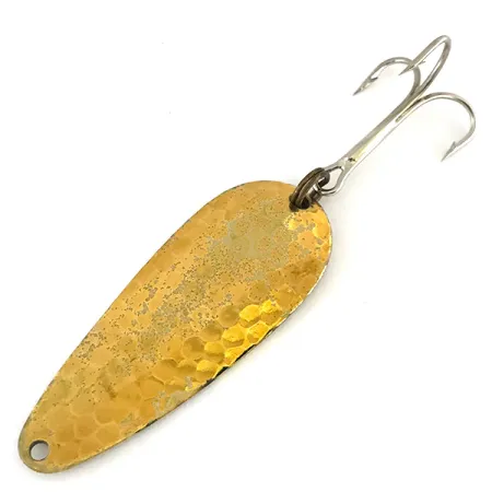 La finitura in oro martellato sulla faccia anteriore riflette la luce da più angolazioni, distinguendo questo ondulante vintage dalle alternative lisce. Lungo 5,5 cm (2 1/4"), il Nebco FlashBait 266 offre un profilo classico a goccia ideale per il lancio. Il lato posteriore rimane liscio e reca il marchio 'NEBCO FLASHBAIT MPLS MINN', a conferma della sua origine da Minneapolis, Minnesota. Con un peso di 10 g (1/3 oz), questo ondulante metallico garantisce una densità notevole per lanci a lunga distanza. Questo esemplare, catalogato con il codice 8214, è in condizioni eccellenti con una valutazione di 5/5. Presenta un'ancoretta affilata fissata tramite un anello spaccato nella parte posteriore e un foro di attacco per la lenza sulla punta.