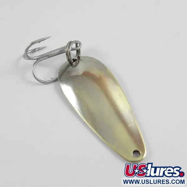 Sul lato concavo con finitura nichelata è chiaramente stampato l'identificativo 'NEBCO FLASHBAIT 2662' insieme all'origine 'MPLS. MINN.', che contrassegna questo artificiale come un autentico pezzo di storia della pesca del Minnesota di metà secolo. Con una lunghezza di 5 cm (2") e un peso di 8 g (1/4 oz), il cucchiaino presenta una distintiva finitura Rainbow Brass over Nickel che riflette la luce lungo il suo corpo a forma di goccia. La struttura utilizza un robusto anello spaccato per fissare un'ancoretta affilata, rendendolo una scelta affidabile per il lancio in acque dolci. La superficie metallica rimane lucida e mostra solo minimi segni di manipolazione, meritando un punteggio di conservazione di 4/5 per un collezionista. Questo esemplare, catalogato con il codice prodotto 2805, rappresenta la classica lavorazione dei metalli americana tipica dell'epoca Nebco.