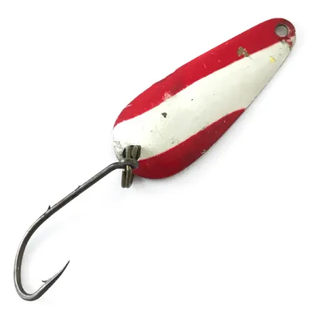 Con un peso delicato di 1/16 oz (1,9 g), questo ondulante vintage evidenzia l'attenzione americana delle origini per la pesca finesse ultraleggera. Il Nebco FlashBait 366, identificato dal codice prodotto 5511, misura 1 1/4" (3,3 cm) e presenta una verniciatura a strisce bianche e rosse ad alto contrasto sul lato anteriore. Sul retro, la superficie con finitura dorata è stampigliata con il nome del marchio e il numero del modello, a testimonianza della sua produzione negli USA. Questo esemplare è in condizioni 4/5, conserva il suo amo singolo bronzato originale e mostra solo lievi segni superficiali dovuti al tempo trascorso nella scatola dell'attrezzatura. La forma a goccia e il dorso dorato lucido sono stati progettati per insidiare persici e trote in acque chiare. Un piccolo foro di fissaggio è situato nella parte superiore del corpo metallico per un nodo diretto o un piccolo snap.