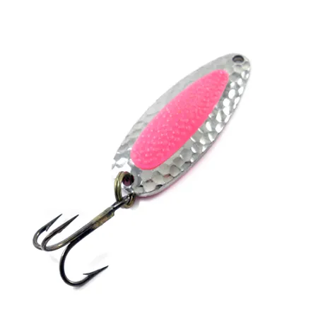 Squame di nichel martellato riflettono la luce sulla superficie di questo cucchiaino in ottone da 5,5 cm (2 1/4"), garantendo un'alta visibilità in varie condizioni d'acqua. Al centro, un inserto in plastica rosa testurizzata imita un uovo di salmone, segno distintivo del design della National Expert Bait Company. Con un peso di 14 g (1/2 oz), l'esca presenta una struttura pesante progettata per raggiungere distanze elevate nel lancio e mantenere la profondità in forti correnti fluviali. Il retro presenta il timbro PIXEE PAT. PEND., che lo identifica come una delle prime produzioni del produttore statunitense, codice 1796, prima che diventasse noto come Blue Fox. Questo esemplare è in condizioni 5/5, con una finitura pulita e riflettente e un'ancoretta originale che rimane affilata e sicura. La sua geometria è studiata per agevolare movimenti a scatti, oscillazioni e rotazioni, sia recuperato in profondi bacini lacustri che tra i frangenti marini.