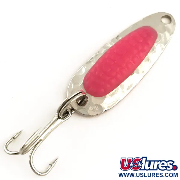 Con un peso di 3/16 oz (4,5 g), il corpo in ottone pesante fornisce la massa necessaria per raggiungere quelle buche lontane dove si nascondono i pesci da trofeo. Una finitura in nichel martellato cattura la luce ambientale sulla sua superficie irregolare, abbinata a un caratteristico inserto rosa che simula le uova di salmone per scatenare l'attacco. Sotto la luce UV, come mostrato nella seconda immagine, quel nucleo rosa brilla intensamente: una caratteristica tecnica progettata da Nebco per mantenere la visibilità in acque torbide o a profondità maggiori. Lungo 1 1/2" (3,5 cm), questo Pixee UV (Codice Prodotto 6369) è uno strumento versatile per i pescatori che insidiano steelhead, salmone o black bass in varie condizioni. La struttura metallica è progettata per sbandare e rotolare nella corrente quando pescata nei fiumi, mantenendo l'esca più a lungo nella zona di strike. Questo esemplare mantiene un aspetto eccellente con una valutazione dello stato di 5/5, con superfici pulite e un'ancoretta affilata.