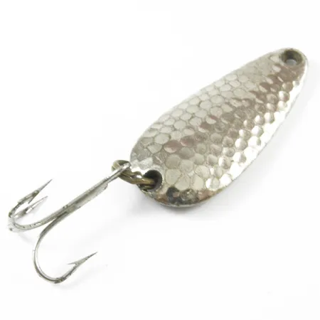 Caratterizzato da una finitura in nichel martellato con fossette profonde, questo ondulante da 4 cm (1 1/2") è progettato per massimizzare la superficie di riflessione della luce. Il lato posteriore rimane liscio e reca il marchio distintivo 'NEBCO TOR-P-DO 1 MPLS. MINN.', che ne attesta l'origine di Minneapolis. Questo esemplare, catalogato con il codice prodotto 3277, pesa 7 g (1/4 oz), rendendolo una scelta solida per chi insidia trote o persici a spinning. La dotazione comprende un classico amo triplo fissato tramite un anello spaccato con superfici ben conservate. Valutato in condizioni 4/5, la nichelatura mantiene una lucentezza di alta qualità su entrambi i lati con solo lievi segni del tempo. Il foro di attacco è forato con precisione all'estremità affusolata, pronto per il nodo diretto o un piccolo moschettone.