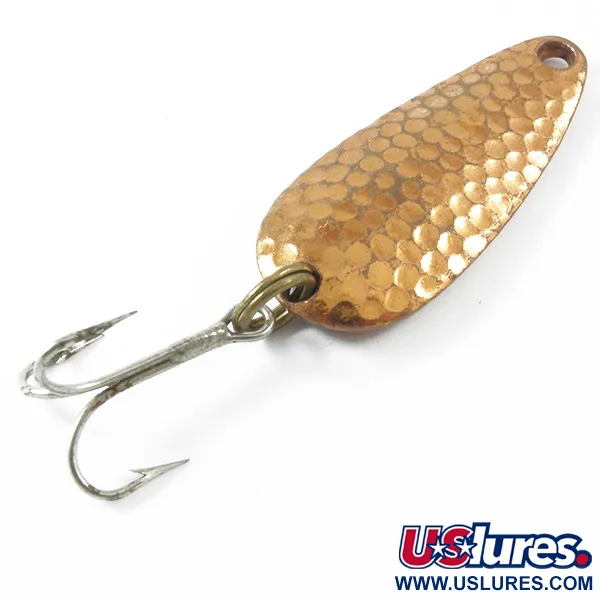 Una finitura in rame martellato definisce il lato frontale di questo cucchiaino vintage, progettato per massimizzare il riflesso della luce da varie angolazioni. Con un peso di 7 g (1/4 oz) e una lunghezza di 4 cm (1 1/2"), il Nebco Tor-P-Do 1 presenta un classico profilo a goccia, tipico della produzione americana di metà secolo. Il retro dell'esca rivela una superficie liscia in rame con i marchi « NEBCO », « TOR-P-DO-1 » e l'origine « MPLS. MINN. », che ne identifica la storia presso il produttore di Minneapolis. La minuteria consiste in un robusto anello spaccato e un'ancoretta pulita, con l'esca che mostra lievi segni del tempo per un punteggio di condizione di 4/5. Catalogato con il codice prodotto 3296, l'occhiello di testa rimane perfettamente circolare e privo di usura strutturale, rendendolo un solido esempio di attrezzatura da lancio statunitense.