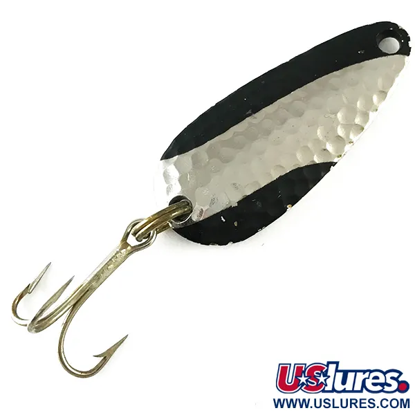 Texture in nichel martellato abbinate a decisi accenti neri definiscono il profilo visivo sorprendente di questo ondulante vintage. Con una dimensione di 1 1/2" (4 cm) e un peso di 1/4 oz (7 g), l'esemplare riporta il marchio distintivo "NEBCO" TOR-P-DO-1 insieme alle sue origini a Ripley, Miss. sul retro lucido. La faccia anteriore presenta una finitura martellata progettata per catturare e riflettere la luce, incorniciata da una vernice nera profonda sulle punte. Identificato dal codice prodotto 6235, l'ondulante è dotato di un classico amo triplo fissato da un robusto anellino spaccato. La realizzazione in metallo pieno è tipica della produzione americana della metà del secolo proveniente dagli USA. Le condizioni sono eccellenti, con una finitura ben conservata e una marchiatura nitida, meritando un punteggio di 5/5. Il foro per la lenza è pulito e forato con precisione all'estremità stretta della forma a goccia.