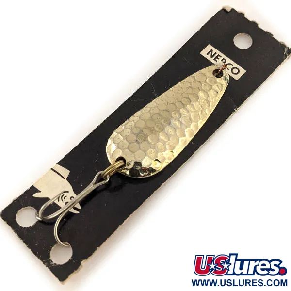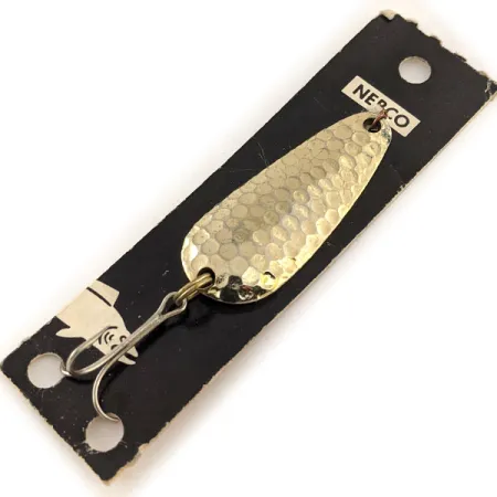 Le finiture in oro martellato come quella di questo ondulante da 14g (1/2oz) sono una scelta classica per creare un riflesso distinto che cattura la luce sott'acqua. Identificato dal codice prodotto 11622, il Nebco Tor-P-Do 2 misura esattamente 5cm (2") e presenta una superficie martellata e testurizzata sulla faccia convessa. Questo esemplare è inutilizzato e rimane originale sulla sua scheda espositiva in cartoncino nero, decorata con il marchio vintage Nebco e un'illustrazione stilizzata di un pesce. L'artificiale è costituito da un corpo in metallo solido abbinato a un'ancoretta affilata fissata tramite un robusto anello spaccato sul retro. La sua forma a goccia è progettata per la stabilità durante il lancio e la traina. La placcatura in oro è brillante e pulita, riflettendo la maestria artigianale tipica delle attrezzature da pesca americane della metà del secolo.