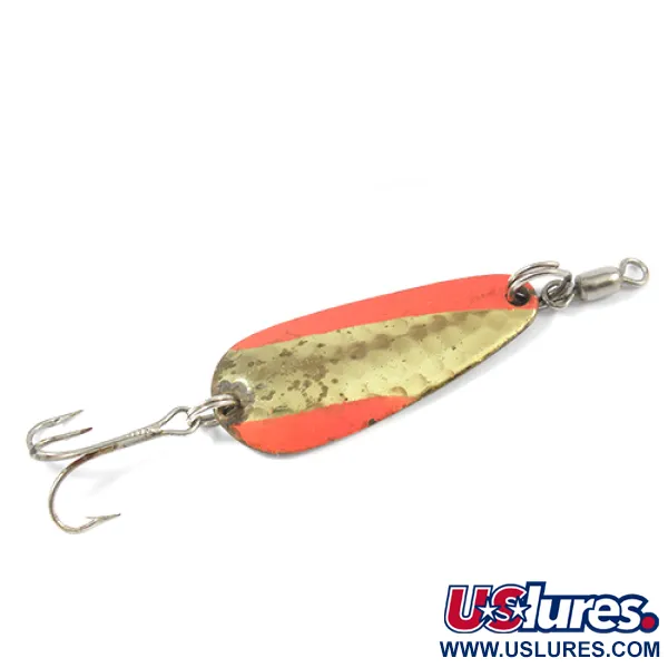 La finitura in ottone martellato cattura la luce sul lato frontale di questo classico prodotto negli USA, caratterizzato da vivaci accenti arancioni sui bordi esterni. Con un peso di 14 g (1/2 oz), il Nebco Tor-P-Do 2 misura esattamente 5 cm (2"). Il lato posteriore rivela una finitura in ottone liscio dove il nome "NEBCO TOR-P-DO 2" è chiaramente punzonato nel metallo. Per i collezionisti, questo esemplare (Codice prodotto 2173) si presenta in un ottimo stato di conservazione con un punteggio di 4/5, mostrando alcuni leggeri segni d'uso che ne esaltano il fascino vintage. La componentistica comprende un robusto amo triplo in coda e una girella barilotto sull'occhiello per prevenire la torsione della lenza durante il lancio o la traina.