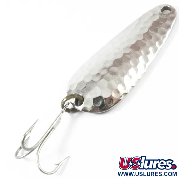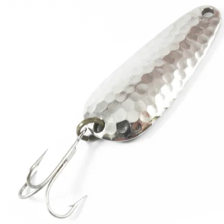 Sul retro in nichel liscio di questo ondulante da 5 cm (2") sono chiaramente impresse le sue origini: "NEBCO TOR-P-DO 2 MPLS. MINN.", un legame diretto con la storia produttiva del marchio a Minneapolis. Questo artificiale da 14 g (1/2 oz) presenta una caratteristica finitura in nichel martellato sul lato convesso, progettata per catturare e riflettere la luce da più angolazioni durante il recupero. L'attrezzatura di questo esemplare, catalogato con il codice prodotto 3585, include un robusto amo triplo fissato tramite un solido anello spaccato, entrambi in eccellente stato. Data la classificazione di conservazione 5/5, le superfici metalliche rimangono lucide e prive di usura o segni significativi. La forma a goccia e la distribuzione del peso lo rendono uno strumento versatile sia per il lancio che per il vertical jigging, incarnando il design americano della metà del secolo scorso. Un foro passante tagliato con precisione all'estremità stretta completa la geometria semplice ed efficace di questo artificiale prodotto negli USA.
