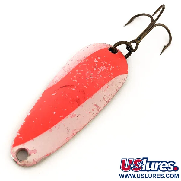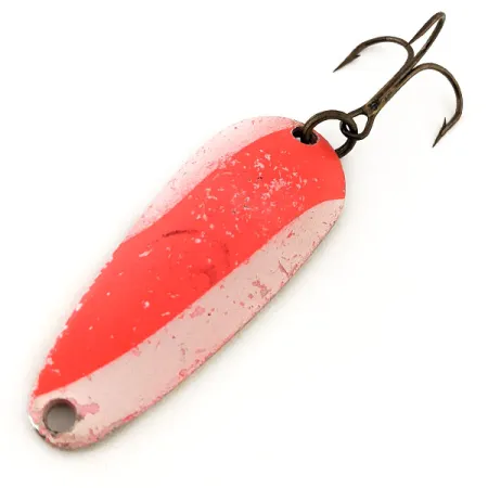 Brillante con un distinto contrasto arancione e blu sotto la luce ultravioletta, la finitura di questo ondulante rivela le sue speciali proprietà fluorescenti. Il Nebco Tor-P-Do 2 UV, identificato dal codice prodotto 13144, misura 5 cm (2") di lunghezza e ha un peso di 14 g (1/2 oz). Mentre alla luce naturale presenta un classico motivo a strisce rosse e bianche, il rivestimento UV-reattivo è progettato per la visibilità in acque profonde o torbide. Prodotto negli USA, questo esemplare è in condizioni 5/5, mantenendo una superficie liscia e una pigmentazione vibrante su tutto il corpo metallico. La componentistica include un robusto anellino spaccato e un'ancoretta affilata con finitura bronzata. I pescatori impiegano tipicamente questa forma a goccia per il casting e la traina. L'occhiello anteriore rimane libero dalla vernice, consentendo un collegamento sicuro a moschettoni o terminali.