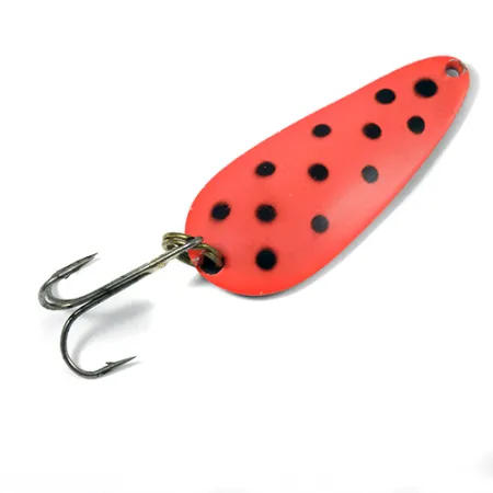 Sul retro nichelato è chiaramente stampigliata la dicitura "NEBCO TOR-P-DO 4", che identifica questo classico cucchiaino ondulante prodotto a Holdingford, Minnesota (USA). Con un peso di 45 g (1 2/3 oz), l'esca è costruita per raggiungere profondità elevate o contrastare il vento nei lanci a lunga distanza. La faccia anteriore presenta una vivace finitura rossa con punti neri, una scelta ad alta visibilità per acque torbide. Lungo 7,5 cm, la struttura robusta riflette il design utilitaristico tipico dell'attrezzatura d'epoca Nebco. Questo esemplare, catalogato con il codice 2083, mantiene il suo fascino con una valutazione di 4/5, mostrando solo lievi segni del tempo. L'hardware è perfettamente funzionale, con un'ancoretta rinforzata fissata tramite un solido anello spaccato alla base del corpo a goccia.