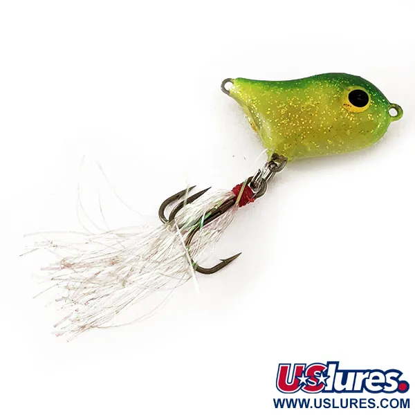 Guarnito con flash argentato e una legatura in filo rosso sull'ancoretta, questo esemplare mette in mostra la classica utilità del design Norman "Front Runner". Il corpo da 2,2g (1/16oz) presenta una vivace sfumatura gialla e verde, pesantemente accentuata da finissimi glitter dorati che catturano efficacemente la luce. Con una misura di soli 3cm (1 1/4"), è stato progettato come teaser di superficie da montare in linea davanti a un walking bait o a un popper più grande. Gli occhi neri sovradimensionati con perimetro giallo rimangono nitidi e centrati, fornendo un bersaglio d'attacco prominente. Con il codice prodotto 11599, questo artificiale prodotto negli USA è in eccellenti condizioni 5/5. La componentistica è lucente e la verniciatura mantiene la brillantezza originale della pancia chartreuse e del dorso verde scuro.